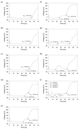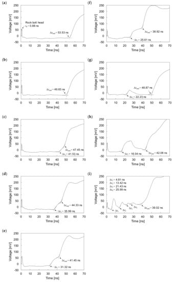 The experiments were conducted with one fully grouted rock bolt and eight defective rock bolts under non-embedded conditions. The measured signal for the fully grouted rock bolt in the non-embedded condition is plotted in Figure 10a. The measured signals for defective rock bolts are plotted in Figure 10b–i. They show that electromagnetic waves are reflected at the head, end, and at defects of rock bolts. All round-trip travel times (t0) of electromagnetic waves reflected at the heads of all rock bolts in the non-embedded condition are 0.88 ns.