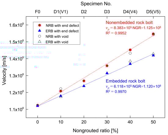 The electromagnetic wave velocity in rock bolts, which depicts the ratio of round-trip travel distance to time difference (Δtend) between t0 and tend, is summarized for all non-embedded rock bolts in Table 1 and plotted in Figure 12. The velocity of the electromagnetic waves in the fully grouted rock bolt (F0) in the non-embedded condition is 1.125 × 108 m/s. In the cases of the defective rock bolts with non-grouted parts at the ends, the velocities of electromagnetic waves in D1, D2, D3, D4, and D5 are 1.208 × 108, 1.269 × 108, 1.358 × 108, 1.452 × 108, and 1.547 × 108 m/s, respectively. The velocity in F0 is lower than that in the rebar (vp = 2.649 × 108 m/s). Furthermore, the velocities in defective rock bolts with non-grouted parts at ends are greater than the velocity in F0. The velocity increases linearly with an increase in the NGR, as shown in Figure 12. The coefficient of determination (R2) for the relationship between the velocity and the non-grouted ratio is 0.9952. This indicates that the velocity can be used to evaluate non-grouted ratios with high reliability.