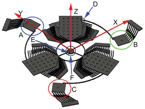 The stiffness and robustness of the structure are provided by three cantilever beams jointed to the silicon substrate through a torsional beam (the pivotal point and the substrate are indicated as E and F in Figure 2, respectively). The three squared sense-masses (indicated as A, B, C in Figure 2) were placed at each free end of the drive masses in order to maximize their distance from the center of rotation, their velocity, and ultimately the resulting Coriolis force. Besides, sense-masses velocity and the resulting Coriolis force are also maximized. Three cantilever beams connect the sense masses to the drive-masses (the joint is indicated as D in Figure 2). The stiffness of the cantilever allows the system to operate in matched modes when the masses detect an angular velocity along the z-axis and in separated modes when an angular velocity is sensed along the y and x axes. The displacement is measured by means of capacitive sensing. Two kinds of sense-mass displacement can be detected depending on the direction of the angular velocity: