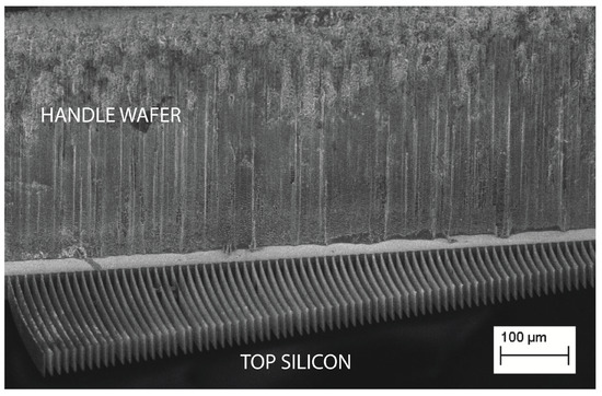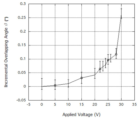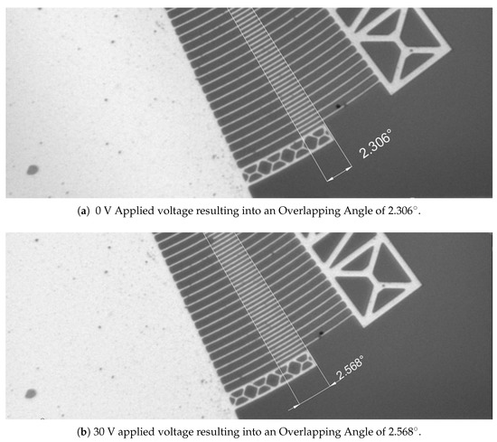 In order to validate the theoretical predictions, a comb-drives prototype (Figure 4) on a 475 m thick SOI (Silicon on Insulator) wafer was fabricated by DRIE (Deep Reactive Ion Etching). The silicon layer was 40 m thick (with 3 m of buried oxide). The device was tested for actuation at 0 and 30 V. Figure 5 and Figure 6 show the behavior of the generated overlap angle as the applied voltage increases.