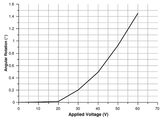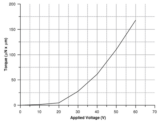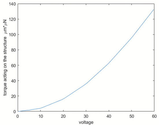 Modeling the electrostatic force acting on the structure corresponds to simulate the actuation process. Hence, a voltage between 0 and 60 V was set to compute the torque acting on the structure, the angular rotation, and the circumferential displacement. Results are presented in Figure 22, Figure 23 and Figure 24.
