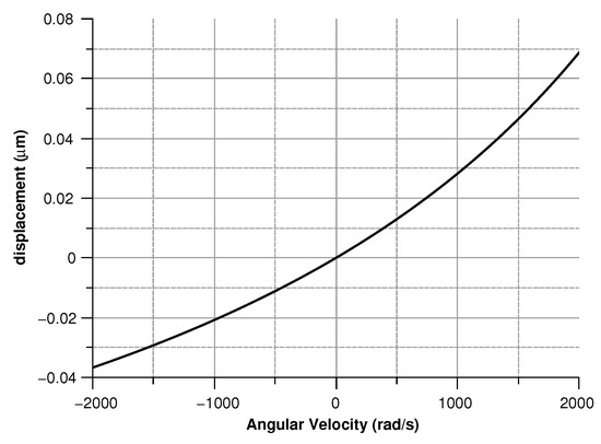 For a clockwise angular velocity (i.e., negative in the graph) the displacement of the sense-mass is in phase with respect to the movement of the drive-mass. On the other hand, for a counter-clockwise (positive in the graph), the displacement of the sense-mass is in counterphase with respect to the movement of the drive-mass. The displacement resulted to be 10 m off compared to the predicted value.