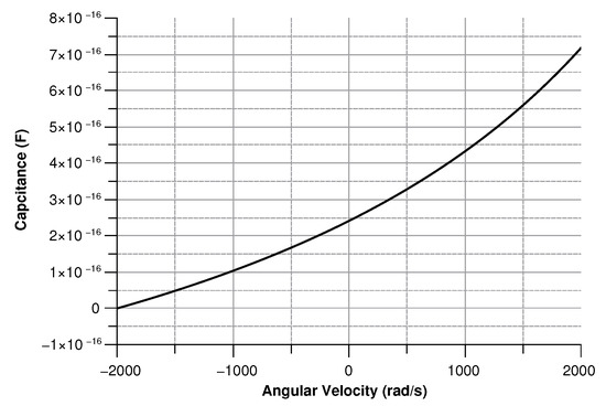 Since the three sense-masses can be modeled as three plane capacitors, the capacitance (Figure 32 and Figure 33) follows along the trends of the displacement. As expected, the capacitance behaves linearly with respect to the displacement. The modulus of the output voltage was computed through (Equation (41)):