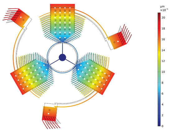 When the angular velocity is directed along the z-axis, the displacement of the sense masses points along the connection with the drive-masses. Figure 25 shows the displacement modulus of the sense-mass tip.