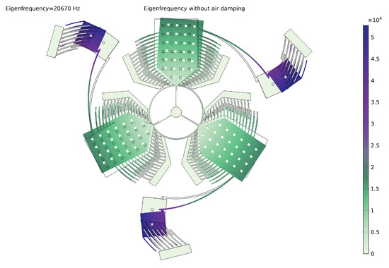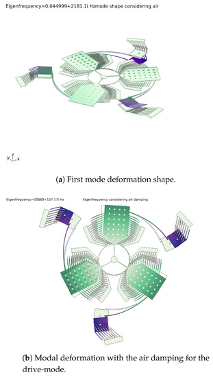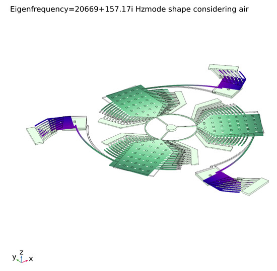 Figure 19b and Figure 21 display the modal displacement for the air and no-air cases, respectively. The complex part of the natural frequency describes the damping due to the air. The Q-factor and the time constant of the sensor could also be calculated (Equation (39)):