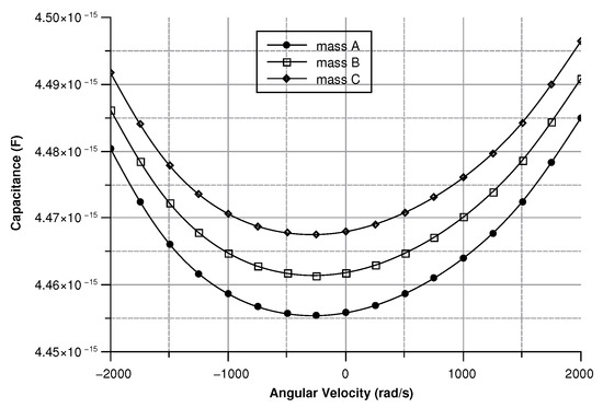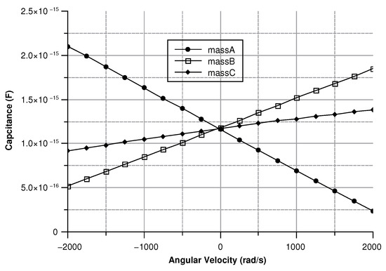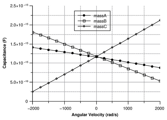 Capacitance of the three sense masses with an angular velocity along the x axis.
