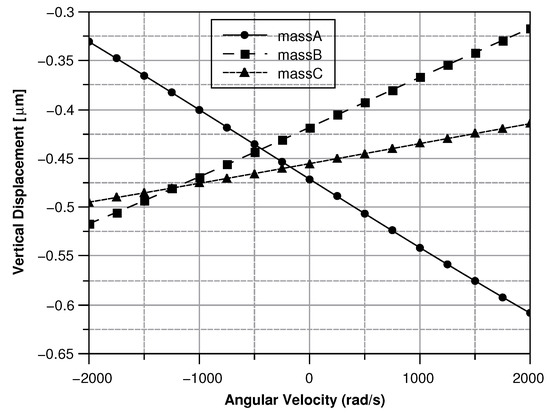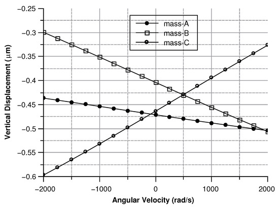 Vertical displacement of the three sense-masses for an angular velocity along the x axis.