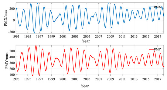 For this work, we used the daily PM time-series derived from the DORIS weekly solutions of coordinates for the time-period of January 1993 to January 2018 (ina18wd01), available on the Internet (ftp://cddis.gsfc.nasa.gov/pub/doris/products/). These data were calculated weekly at the Russian Academy of Sciences Institute of Astronomy (INASAN) analysis center using DORIS data and GIPSY/OASIS II software, which was developed by the Jet Propulsion Laboratory (JPL) [29] and was significantly expanded for DORIS applications [30] by a joint cooperation between the Institut Géographique National (IGN) and JPL. This package was also adapted by the IGN for the DORIS data analysis [31].