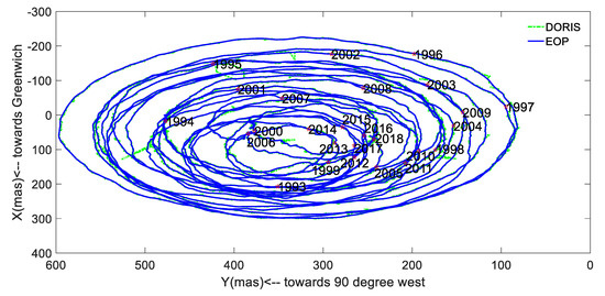 Polar motion (PM) describes the motion of the rotation axis of the Earth, relative to the crust, and is closely related to the Earth’s structure and composition. Many geophysical changes of the Earth cause movements of the pole, such as melting ice sheets, the global water cycle, sea level variations, postglacial mass readjustments, seasonal changes of the atmosphere, and other factors [1]. The study of PM can provide valuable information for studying many geophysical and meteorological phenomena [2,3,4]. DORIS (doppler orbitography and radiopositioning integrated by satellite) is a mature space geodetic technique that is slightly younger than the other three, such as the global navigation satellite system (GNSS), very long baseline interferometry (VLBI), and satellite laser ranging (SLR). Compared to SLR and VLBI, the DORIS system has a uniform global distribution of beacons and high observation accuracy that has advantages in space geodetic research and satellite orbit computation, such as precise orbit determination of Low Earth Orbit (LEO) satellites, calculation of Earth’s rotation parameters, geocentric movement research, establishment of the International Terrestrial Reference Frame (ITRF), vertical crustal movements, etc. [5,6]. Nowadays, this system can determine the orbits of the LEO satellites at a precision level of 1–2 cm, and has been applied in the establishment of ITRF2005, ITRF2008, and ITRF2014 [7,8,9,10,11,12]. Gambis [5] analyzed the short-term PM series calculated by DORIS and found that differences in PM solved by DORIS and that by IERS C04 were 1.13 mas and 0.69 mas, in the X and Y directions, respectively. Lian et al. [13] evaluated the accuracy of the Earth’s rotation parameters solved by DORIS, SLR, VLBI, and GPS, and compared the resolution derived from the four geodetic techniques. Except for the above two studies, there are few other studies that involve PM derived from DORIS.