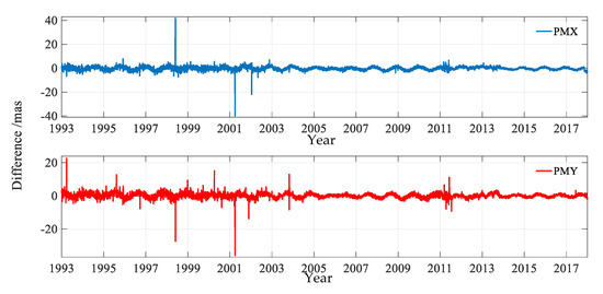 It can be observed from Figure 3 that the difference in polar motion was large and unstable from 1993 to April, 2002. This effect could be explained by the fact that only the data from the SPOT-2, SPOT-3, SPOT-4, and TOPEX/POSEIDON were applied, and the receivers on board were first generation, which could only track 1 beacon at a time. After April 2002, the DORIS data from the SPOT-5 and ENVISAT satellites were added, and the receivers loaded on both satellites were second generation receivers that could track 2 beacons at a time. The significant precision improvement of the X and Y pole components after April 2002 was related to the increase of the satellite number from 3 to 5. Every time a new satellite was added, the quality of the PM parameter series got better [32]. After May 2004, the difference became small and stable; the main reasons were the increasing number of satellites and beacon stations, and the new generation of receiver on board also contributed to the high accuracy and stability of the polar motion parameters.