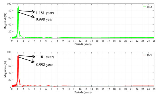 Figure 4 reveals two important peaks in both PMX and PMY, which indicate that these two peaks were responding to the 0.998-year annual signal and 1.181-year signal, respectively. The 1.181-year term represents the period of Chandler wobble, which is a free oscillation, and the annual one is the annual wobble, which is a natural oscillation. In both directions, the magnitude of 1.181 years was more powerful than that of 0.998 years, which suggests that the Chandler wobble had a more severe oscillation than the annual one.