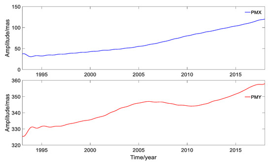 However, for further long-term trend analysis of DORIS PM, greater efforts should be put into researching the mechanism of PM derived from this space geodetic technique, which would provide further deep comprehension of the Earth’s structure, inner material movement, water storage changes, ice melting, and so on from the viewpoint of this newly developed technique. In addition, a PM period longer than 10 years was detected, while the spectrum of this component was not outstanding, as compared to the other main components. Therefore, further study would lengthen the time-period of the time-series, solved by the DORIS data. All these research studies would provide an important theoretical basis for the prediction of PM and the study of geo-hazards, tectonics, Earth structure and composition, and so on.