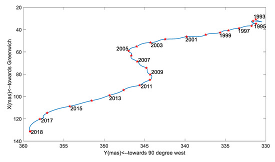 Figure 1 displays the values of PM in the X and Y directions, and the maximum values were 300.515 mas and 596.492 mas, respectively. Figure 2 shows that the ‘polhody’ from January 1993 to January 2018 solved from the DORIS observations had a good agreement with the results published by IERS (https://www.iers.org/IERS/EN/DataProducts/EarthOrientationData/eop.html), using EOP 14 C04 data derived from multiple space geodetic techniques.