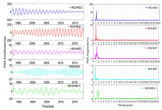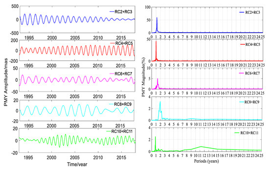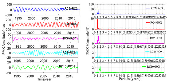 Similarly, Figure 7, Figure 8, Figure 9 and Figure 10 and Table 2 also indicate that RC4 and RC5 were a pair in the X and Y directions and had the same 0.998-year period. At the same time, Table 2 also showed that the magnitudes of RC4 + RC5 were all larger than 42.6%, which indicated that RC4 and RC5 were another pair of main components. These components correspond to the annual wobble which was a seasonal signal. The annual pole movement was due to seasonal atmospheric, oceanic, and groundwater distribution processes, and the main cause was the annual inertial variation that was accompanied by seasonal redistribution of the mass of the atmosphere. The redistribution of mass and the global response of the oceans to annual changes in atmospheric pressure, could also stimulate the annual pole shift by changing the inertia product. In addition, the annual PM could also be stimulated by a change in the mass distribution of the annual changes of water storage, including snow and ice [35].