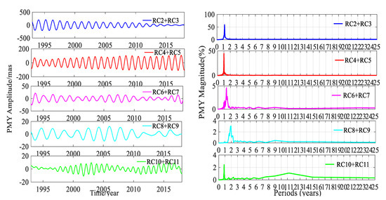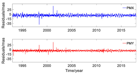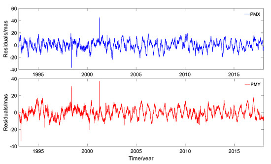 It can be observed from Figure 11 and Table 3 that the RMSs of residual components were 7.050 mas and 6.007 mas, respectively, and they accounted for 0.51% and 0.07% of the RCs for PMX and PMY, respectively. In general, the residuals with such small contribution could be regarded as noise. However, as can be seen in Figure 11, there still seemed to be some periodic variations clearly visible. According to the analysis, we could not conclude that the residuals were gross noise.