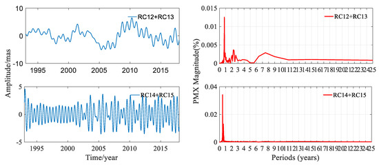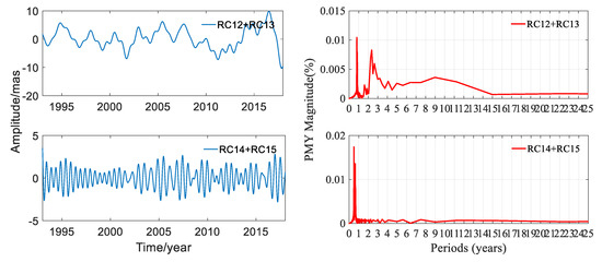 Figure 12 and Table 4 displayed that the periods of RC12 + RC13 for PMX were 0.788, 2.244, and 7.481 years, and the amplitude was 6.507 mas. The period of RC14 + RC15 was 0.499 year, and the amplitude was 4.592 mas in the X direction. It can be seen from Figure 13 and Table 4 that the periods of RC12 + RC13 for PMY were 0.802, 2.363, and 8.978 years, and the amplitude was 9.884 mas. The period of RC14 + RC15 for PMY was 0.499 year, and the amplitude was 3.638 mas. These signals were small compared to the full signal, while the periods of RC12 + RC13 and RC14 + RC15 were significant. It should be noted that the result indicated that RC14 + RC15 was a semi-annual signal.