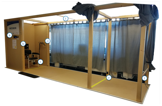 The USS consisting of: (a) the introductory display and an RFID authentication device, (b) the main display for user-interaction, (c) the integrated aTUG chair with additional LBs, (d) a sensor-belt including an inertial sensor, (e) light barriers at a 3 m walking distance, and (f) the Intel RealSense™ D435 Depth image camera placed approximately 4 m from the chair and from the upper level facing it.