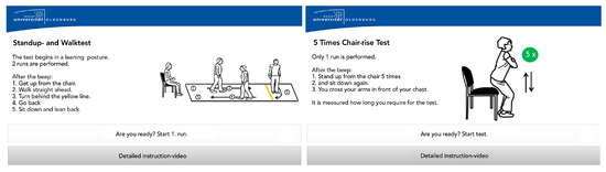 Examples for the instructional screens for the TUG and 5SST. Since the prototype was only evaluated and implemented with German native speakers, the screens were translated into English for this article.