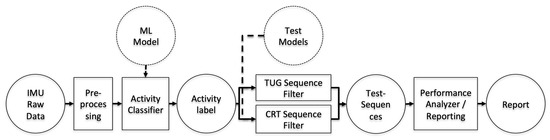 System workflow for processing raw IMU data and reporting via machine-learning-based activity classifiers, a rule-based model for test detection, and performance analyses.