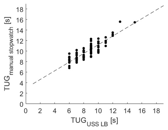 Linear regression among the manual stopwatch and the USS’s LB measurements for the TUG test.
