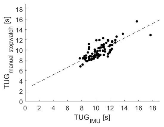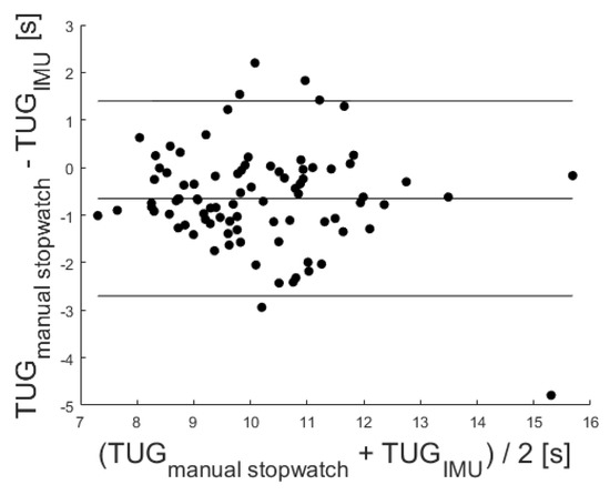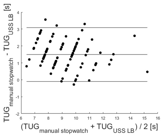 Additionally, the conformity among the reference stopwatch measures and both sensors was evaluated via Bland–Altman plots (see Figure 6 and Figure 8). Since the mean difference was 1.49 for the LB and −0.65 for the IMU, both sensors held a fixed bias. The LB bias resulted from the LB not measuring initial reaction times. The findings agreed with a corresponding previous study [24]. The negative mean difference of the IMU might result from the sensor’s higher sensitivity to initial movements of the upper body and the delayed reaction times of the study nurse handling the stopwatch. Due to a reported Minimal Detectable Change (MDC) of the TUG test varying between 1.14 s [39] and 3.4 s [40], the given differences within the mean ± 1.96 SD might not be clinically relevant, and the USS sensor-based measures may be used in favor of stopwatch measures.