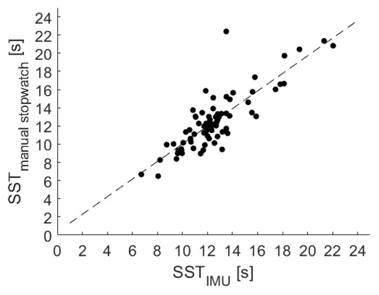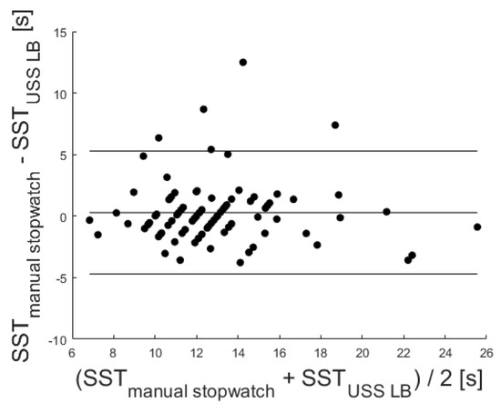 Under all considered conditions, the USS measures showed a positive offset compared to the stopwatch measures (ranging from 0.35 s for the IMU-based SST to 3.83 s for the LB-based SST). This offset resulted partially from the higher sensitivity of the USS measures to detect the movement initiation earlier than the study nurse. Similarly, the end of the test might be measured longer. The minimal offset in the case of the IMU-based SST measure could be explained mainly by this effect because of holding a regression coefficient of 0.97. However, the offsets of the other three measures as well partially counterbalanced the regression coefficients (ranging from 0.71 to 0.82).