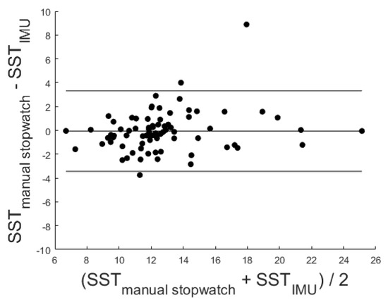 The corresponding Bland–Altman plots indicated a strong conformity between both sensors and the stopwatch measure (see Figure 10 and Figure 12). With a low mean difference (LB of 0.29 and IMU of −0.06), both sensors had a slight intercept. The MDC of the SST differed in the literature depending on the observed study sample. For example, Goldberg et al. [41] found an MDC of 2.5 s in older females and Blackwood [42] an MDC of 3.54 s in older adults with early cognitive loss. Therefore, the recognized differences within the mean difference of ± 1.96 SD might not be clinically significant.