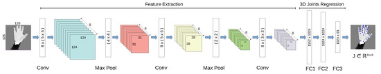 The architecture of Convolutional Neural Network (CNN)-based hand pose estimation algorithm. The CNN takes a 128 × 128 input preprocessed image. It consists of 3 convolution layers each followed by an ReLU activation and max pooling. Afterwards, there are 2 fully connected layers with ReLU activation. A third fully connected layer (joint regression layer) regresses 3D joint positions. Conv stands for a convolution layer. Each conv is followed by a ReLU activation. FC denotes a fully connected layer.