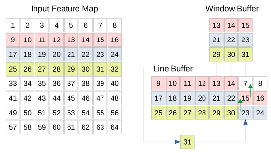 Figure 4 shows the basic structure of the line and window buffer where the fourth line of the input map is being buffered. Furthermore, the window buffer is highlighting a 3 × 3 region which will be treated by a kernel of the same size. Whenever a new input comes, the corresponding column is shifted up allowing the pixel to be inserted.