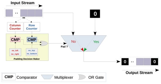 Zero padding is the process of increasing the size of a feature map by adding extra rows and/or columns of zeros at its borders. Furthermore, the dimensions of the input feature maps of a max-pooling layer should be multiples of the pooling filter dimensions, given that the strides are equal to the filter dimensions. Otherwise, the filter would not fit at some or all feature maps borders. In our work, we use a zero padding layer to pad the top and left borders in the input feature maps of the second pooling layer, as it uses a pooling filter of size 2 × 2 for the input dimensions of size 27 × 27. Figure 5 illustrates a simplified representation of the padding layer architecture. The multiplexer pushes a zero to the output stream when padding is needed, while it relays the input to the output otherwise. This decision is based on the values of two counters (namely, row and column counters). These counters keep track of the horizontal and vertical locations of each input value relatively to the corresponding output feature map. Algorithm A2 in Appendix A.2 shows a code snippet for zero padding.