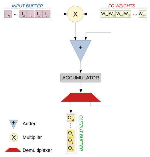 The core operation of a fully connected layer is multiply and accumulate operation, where each value in the input buffer is multiplied by the corresponding weights, and the results are then added to the accumulators and stored there. Each value is multiplied by a number of weights equal to the number of neurons in this layer. The basic architecture of this layer consists of a multiplier, an adder and an accumulator, as shown in Figure 6. When the multiplications are complete, the result value is passed to the ReLU activation function and then streamed out to the next layer via the output buffer. In some scenarios, such as in the last fully connected layer, no activation function is needed. To support parallelization, this architecture is instantiated a number of times equal to the parallelization degree. Multiplications will then occur in parallel and a number of accumulators are updated simultaneously.