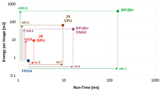 Performance analysis for different embedded platforms; FPGA, JX GPU, JX CPU, RPI3B+ and RPi3B+ ONNX denote the performance of our Xilinx UltraScale+ FPGA, Jetson Xavier embedded GPU, Jetson Xavier embedded CPU, Raspberry Pi 3B+ simple CPU and Raspberry Pi 3B+ ONNX-Runtime-based CPU implementations, respectively. Similarly to Figure 9, the numbers on the arrows illustrate the factors by which the performance differs for different implementations.