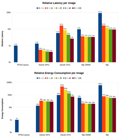 Table 4 shows that our FPGA implementation is more energy efficient when compared with the NVIDIA Jetson Xavier and Raspberry Pi 3B+. Specifically, when the batch size is 1, the average energy demand per image on Jetson Xavier’s GPU and CPU is 9.06 mJ and 64,872 mJ, respectively. Moreover, the average energy consumption for inference on Raspberry Pi 3B+ is 39.30 mJ using ONNX-Runtime while it rises to 395.12 mJ for the simple ARM7 CPU implementation. In other words, our FPGA implementation is 13.6 and 97.2 times more energy efficient than the Jetson Xavier GPU and CPU implementations, respectively. Furthermore, if we compare the Raspberry Pi 3B+ implementation with ours, we observe that the former consumes 58.9 times more energy when running with ONNX-Runtime, while it consumes 591.9 times more energy when running on the CPU without ONNX-Runtime.