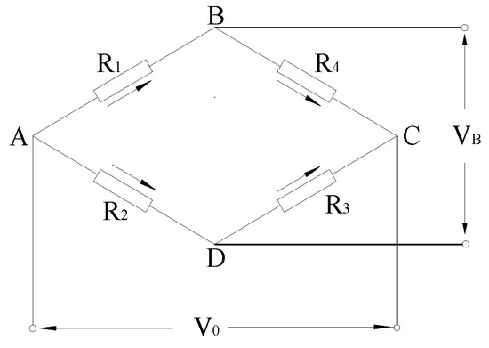 where is the power supply voltage (V); is the output voltage (V); and , where , , and is the strain value of the ith resistor; thus: