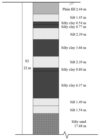 The construction project site is located in Hekou district, Dongying city, with relatively flat terrain and large local fluctuations. The geomorphologic unit belongs to the quaternary alluvial plain of the Yellow River delta, with a single geomorphologic type, relatively simple stratigraphic structure, relatively uniform horizontal distribution, and vertical layer by layer distribution. According to the exploration, except the plain fill on the surface, the substratum is composed of silt, silty clay, and silty sand in the quaternary alluvium of the Yellow River delta. According to its alluvial genetic types and physical and mechanical indicators, the foundation soil layer within 30 m longitudinally is divided into 12 layers. The distribution of soil layers is shown in Figure 4. The physical and mechanical indicators of each foundation soil layer are shown in Table 1. The underground water level of the site is 0.30–3.00 m.