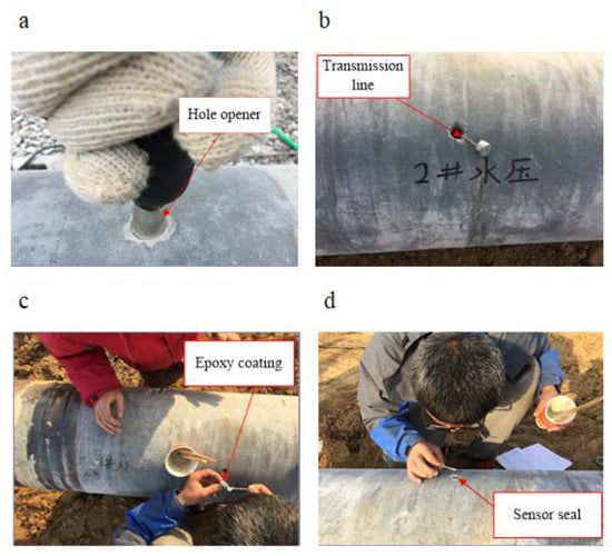 According to the testing requirements of the pile jacking process, the pore water pressure sensor at the pile–soil interface must be specially designed to be successfully placed on the surface of the pile body, and the following three conditions must be met: Sensor survival, sensor surface, and pile surface level sensor transmission line from the pile core effectively. Therefore, the key to successfully testing the pore water pressure at the pile–soil interface is the setting method of the pore water pressure sensor. When setting, to make the sensor surface flush with the surface of the pile body, a drill bit with a diameter of 12 mm and a hammer should first be used drill holes in the surface of pile body, and then that with a sensor diameter of 20 mm should be used to punch openings in the hammer-drilled holes, with a hole diameter depth of 20 to 12 mm; the hole size should be in strict accordance with the size of the sensor design. The hole opening by the hole opener is shown in Figure 6a. The pore water pressure sensor is placed in the hole on the surface of the pile, and the sensor transmission line is first introduced into the pile core from the hole before the sensor is placed, as shown in Figure 6b. Then, epoxy resin should be applied to the side of the sensor, as shown in Figure 6c. Finally, the sensor mounted on the surface of the pile was sealed with epoxy resin and cured for 24 h, as shown in Figure 6d. In addition, the surface of the pore water pressure sensor is protected by transparent plastic to prevent the permeable stone from blocking before the pile is jacked. The day before the pile was jacked, the permeable stone of the pore water pressure sensor was filled with water, and the air in the cavity of the pore water pressure sensor was soaked with water for 24 h to discharge.