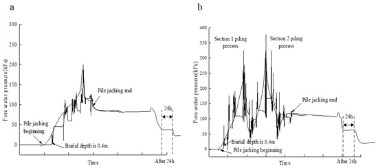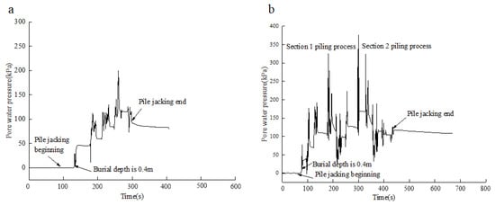 h/D = 1 (h is the distance between the pore water pressure sensor and the pile end; D is the pore water pressure sensor of test pile diameter) as an example. Figure 7 shows the change law of pore water pressure at the pile–soil interface during pile jacking. The S1 test pile jacking time is 09:52:57–09:55:20 on November 27, 2017, and the S2 test pile jacking time is 10:54:00–10:59:48 on November 27, 2017.