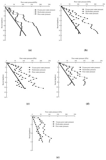 Variation curves of excess pore water pressure of pile–soil interface with depths during pile-jacking: (a) h/B = 1, (b) h/B = 3, (c) h/B = 7, (d) h/B = 15, (e) h/B = 27.