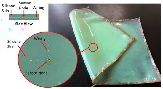 To overcome the aforementioned challenges for robotic tactile sensing, Stanford Structures and Composites Laboratory (SACL) developed a smart skin shown in Figure 1 by embedding a multi-modal stretchable sensor network [] into a soft silicone. Guo [] has documented in detail the fabrication and material selection process of this skin. This artificial skin has been added to a robotic arm for realizing autonomous control, which leverages advanced sampling-based motion planning techniques []. Utilizing the signals of the multi-modal sensors, which are embedded in the skin in state awareness algorithms as input parameters, the robotic arm can sense and react to environmental changes such as temperature variance and local dynamic impacts onto the skin []. However, one critical aspect in tactile sensing has not been well studied, which is how to detect static pressure in the smart skin using lead zirconate titanate (PZT) elements, also known as piezoelectric sensors.