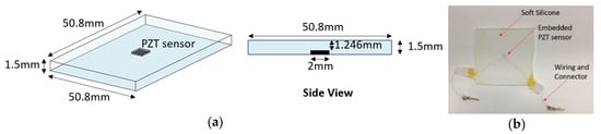 The development of the smart skin sample is presented in this section. The 3D schematic of a smart skin sample with an embedded lead zirconate titanate (PZT) sensor is shown in Figure 3a. This sensor, whose dimensions were 2 mm × 2 mm × 0.254 mm, was fabricated by APC ceramics. The material properties of this PZT sensor can be found in Table 1. The wired sensor was then embedded in the skin-like soft silicone rubber material (Smooth-On Ecoflex 00-30 []), as illustrated in Figure 3b, to form a smart skin sample. This sample was 50.8 mm by 50.8 mm, with a thickness of 1.5 mm.