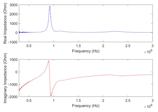 To apply the static pressure load, in each instance a 50 g calibration weight was gently placed on top of the embedded PZT sensor, as shown in Figure 4. To guarantee a uniform pressure, a rigid thin composite plate with dimensions of 20 mm by 20 mm was placed between the skin and the calibration weight. Two wires (AWG 40) of 80 µm in diameter embedded in the silicone skin extended the top and bottom electrodes of the PZT sensor, respectively, to the outside of the skin, which were then connected to a PC-connected impedance analyzer (SinePhase Impedance Analyzer 16,777 k). This impedance analyzer then actuates the PZT sensor over a designated range of frequencies, and collects the impedance response accordingly over this frequency range. In the experiment, the impedance signal was recorded at each load increment. One of the collected impedance signals for 100 kHz to 3 MHz, with an increment of 1 kHz, is shown in Figure 5. Both the real and imaginary parts of the recorded data are shown in Figure 5; however, only the real part was used for later analysis. The first resonant peak is around 900 kHz, which corresponds to the radial vibration modes of the PZT sensor.