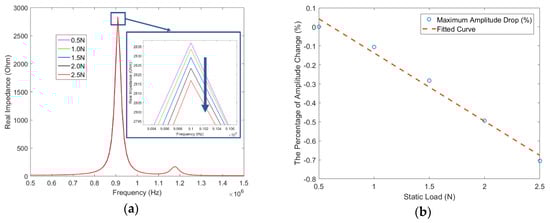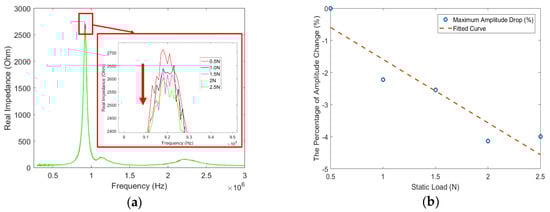 In this study, we focused on the real part of the impedance response. As illustrated in Figure 6a, in general, a gradual decrease in the amplitude at the first peak frequency happens with the increment of the static pressure load. The maximum amplitude value at each load was extracted. The percentage change of these values at each load, with respect to the maximum amplitude value at 0.5 N, were plotted in Figure 6b. Directly comparing the maximum amplitude under each load is the traditional method that has been previously investigated and applied at large load levels [,]. In our case, however, since the load level is as small as 0.5 N, this direct comparison of maximum amplitude does not work well. It can be observed that although there is a decreasing trend, there exists inconsistency at the load of 2 N. This is due to the mismatch between this high-resolution load and the limited sampling rates of the data acquisition system.