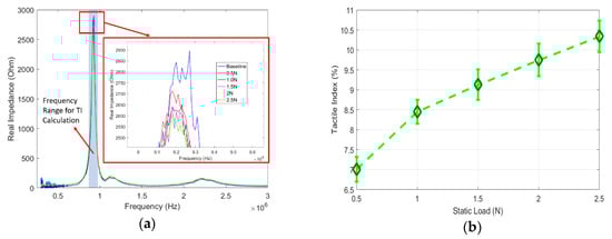 To apply this TI, baseline data were selected as the impedance response at 0 static loads, as shown in Figure 7a. Note that there is a perceivable difference between the baseline signal and the signals under static loads. This is due to the different force boundary conditions in these two different scenarios. This tactile index is essentially describing the average impedance change from the baseline signal at each corresponding load. By using this definition, the applied frequency range is centered in the first peak frequency within a range of 50 kHz, as shown in Figure 7a. Note that to collect data over this 50 kHz frequency range, the response time was about 600 µs. The TI values were then calculated under each static load and plotted in Figure 7b with error bars, which was based on five individual tests. It is observed that with the increment of static pressure load, the TI values consistently increase, and are highly distinguishable for each force increment of 0.5 N, which was the minimal detectable force in this current setup, with a sensitivity of 1.8%/N. This resolution is comparable to capacitive sensors, and proves its great sensitivity in terms of detecting the static pressure load using the proposed diagnostic method.