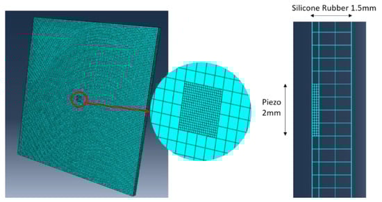 The FEM model and mesh of the smart skin sample with an embedded PZT sensor.