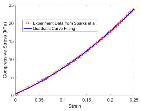 Therefore, to correlate the stress level to the silicone’s stiffness change, the stress and strain relationship from Sparks’ experiment result was fitted into a quadratic curve, which is also plotted in Figure 9. This quadratic curve is presented explicitly in Equation (4), where S denotes stress and ε denotes strain. The stresses at each load increment in the experiment were used to calculate the corresponding strains using Equation (4). These strain values were then used to obtain the corresponding stiffness as the slope of the quadratic curve at each stress level. Table 3 shows the values of stress, strain and stiffness at each load increment. Note that the weight of the rigid composite plate, which is 1.5 g and used for even pressure distribution, was also taken into consideration.