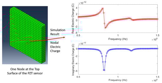 A direct steady-state dynamic analysis was performed using Abaqus 6.12. A zero displacement in the x, y and z directions on the bottom surface of the skin was considered as mechanical boundary conditions. The following electrical boundary conditions were applied to the sensor: a constant voltage of 1 V in magnitude and 0 in phase at the top surface electrode of the PZT sensor, while the bottom surface electrode was fixed as the ground of 0 V. For each simulation, the nodal electric charges at the top surface electrode were extracted and summed to compute the total electrical charge (Q). Figure 10 shows the simulation result of the nodal electric charge at one node at the top surface. Again, the total electric charge (Q) is the summation of these nodal electric charges over all the nodes at the top surface of the PZT sensor.