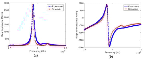 Comparison of the experiment and simulation results on the impedance behavior of a PZT sensor embedded in the silicone rubber: (a) real part; (b) imaginary part.