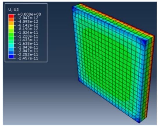 Since in Equation (7), Y is also a function of PZT geometry, it is necessary to investigate the stress effects to variations of PZT geometry to evaluate its influence on the impedance response. More specifically, geometry parameters of w, l and h—which are the width, length and thickness of the PZT sensor—were taken into consideration. Finite element model (FEM) simulation analysis of the PZT sensor under static normal pressure was performed. The material properties, element type and mesh size were the same as described in the impedance simulation section. The bottom surface of the PZT sensor was applied a mechanical boundary condition with fixed displacement in all three directions. The top surface of the PZT sensor was applied a static normal pressure load of 6.29 kPa, which is the maximum load shown in Table 3. Figure 14 shows the displacement distribution in the thickness direction. The maximum displacement in the thickness direction is −2.457 × 10−11 m. For the width and length direction, the maximum displacements are 1.621 × 10−11 m and 1.885 × 10−11 m, respectively. By plugging these changes into Equation (7), we found that the overall changes to the impedance response are at the level of 0.0002%. This change is essentially extremely small compared with the experiment results, which have a change of 5% in the amplitude decrease. Therefore, in this study, the effect of stress on PZT geometry changes to impedance response can be neglected.