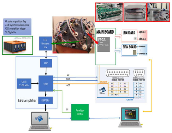 All the required fNIRS electronic processing was hosted by a Zynq Field-Programmable Gate Array (FPGA)-based System on Chip (SoC), featuring an adjustable LED current and configurable SiPM gain. This architecture was already presented in [36]. The FPGA implemented a full digital lock-in in order to minimize ambient light contamination, electronic noise, and interference with the EEG. The fNIRS and EEG components were effectively synchronized with the fNIRS acting as a slave system.