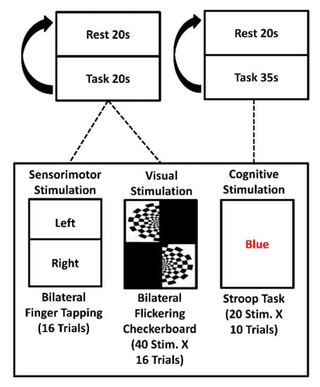 To elicit motor cortex activity, the subjects were requested to perform a left-hand and right-hand finger tapping task with the instruction (‘left’, ‘right’ and ‘stop’ commands) presented on a 19′ screen. The experiment was composed of 20 s of rest alternated with 20 s of task repeated 8 times for each of the two stimuli (left or right finger tapping, presented in a pseudorandom order), for a total of 16 trials. To induce visual cortex activity, the subjects were requested to stare at the 19′ screen at a distance of ~90 cm and to look at a fixation cross while left and right field-of-view flickering black-and-white checkerboards were presented at a frequency of 2 Hz [42]. The task was composed of 20 s of rest and 20 s of stimulation for 8 trials repeated 8 times for each of the two stimuli (left or right visual hemifield, presented in a pseudorandom order), for a total of 16 trials. To elicit frontal cortex activity, a Stroop task was performed [43]. The Stroop task is a paradigm that involves the inhibition of automatic responses. Stimulus conflict-words and color patches were used; the participants were requested to press a button associated to the color of the letters presented (4 colors employed: Red, Blue, Yellow, Green). The inhibition of automatic response occurs when there is a mismatch between the name of a color and the color that is printed on the screen (i.e., the word ‘red’ printed in blue ink instead of red ink). The experiment was made of 10 trials of 20 stimulations with a maximum interstimulus time interval of 2 s. All the stimulations were presented using Psychtoolbox, a software implemented in Matlab environment [44].